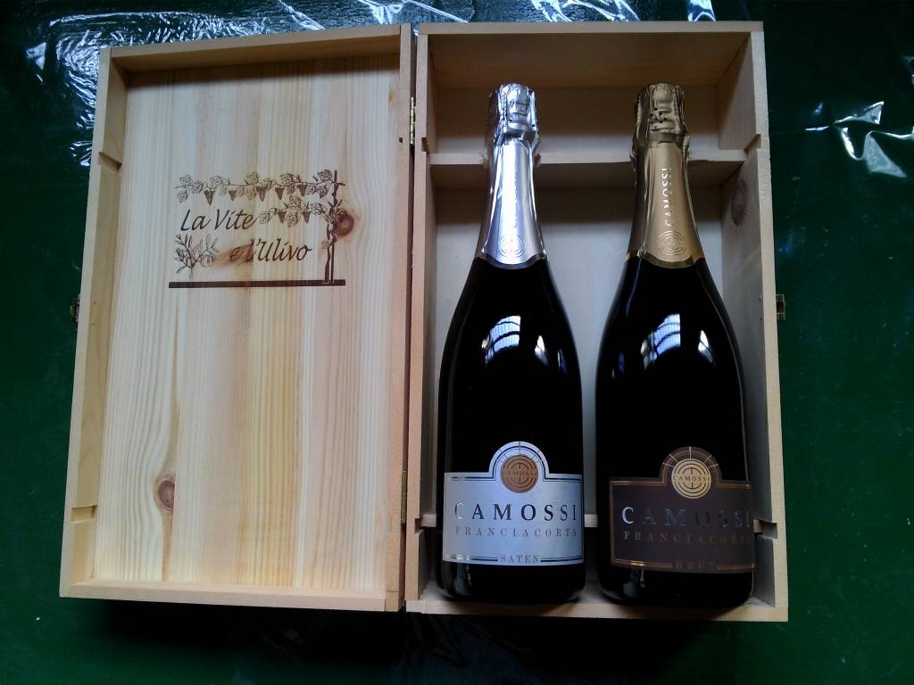 ART CH-FR Cassetta legno massello con logo 1 bott Champagne Grand Cru Blanc de Blanc cl 75 JEAN PERNET / 1 bott Franciacorta Extra Brut 2006 Docg - Az. Camossi