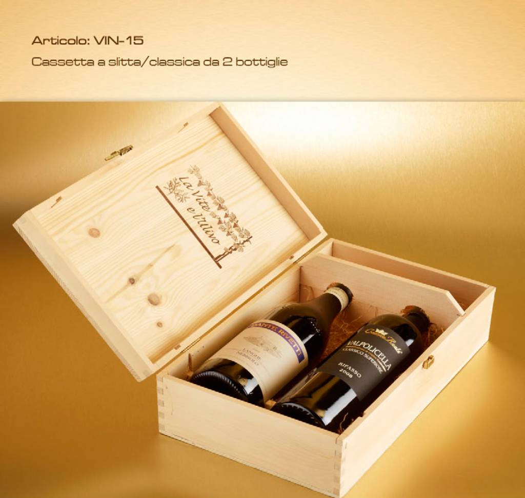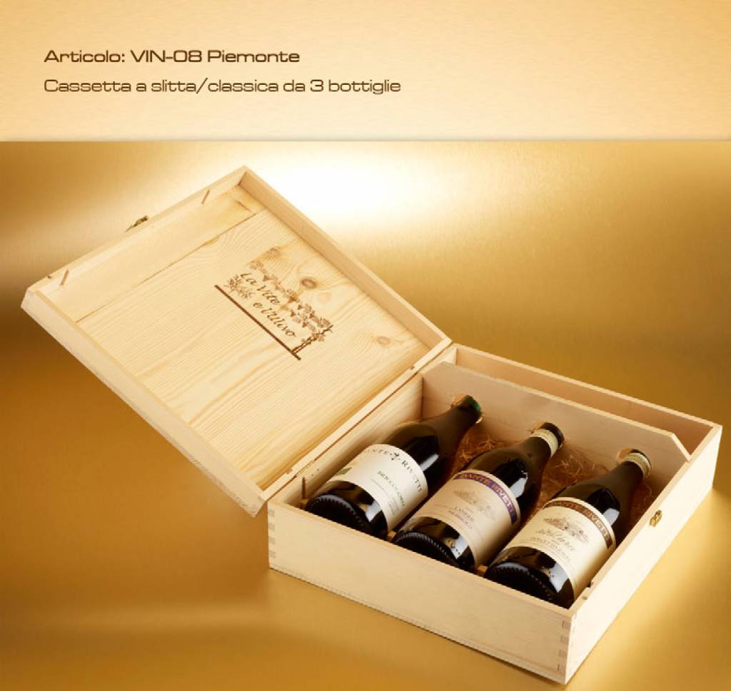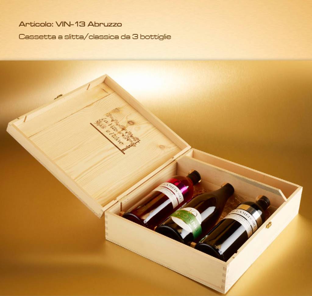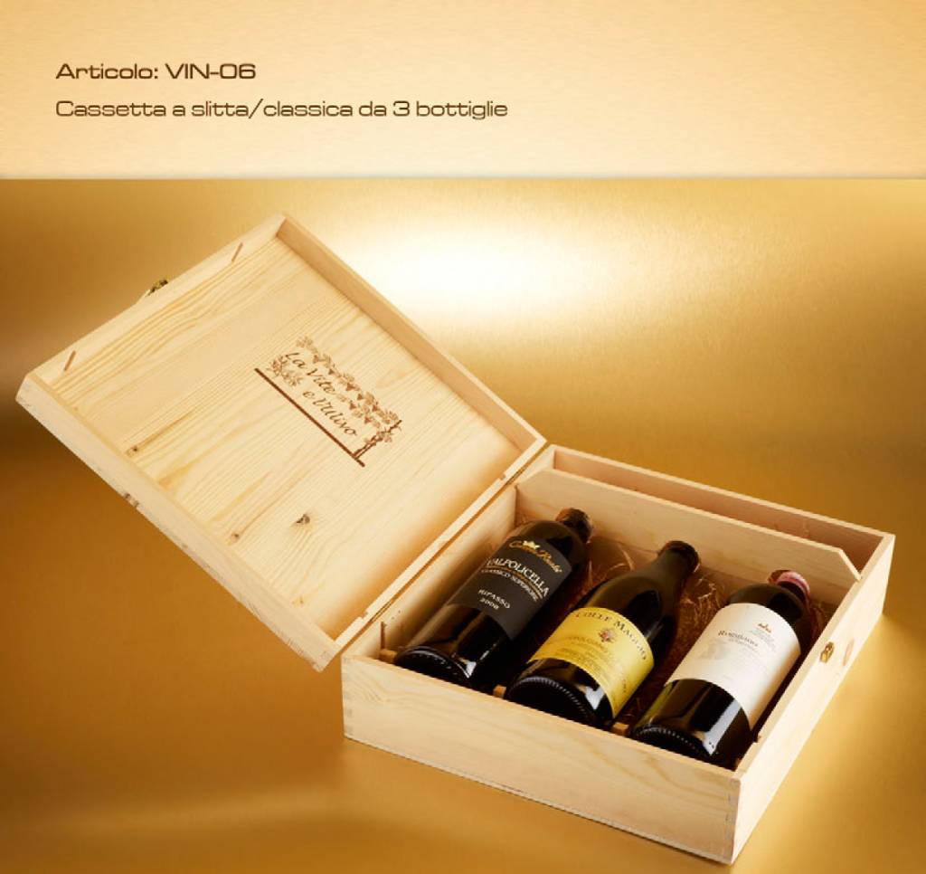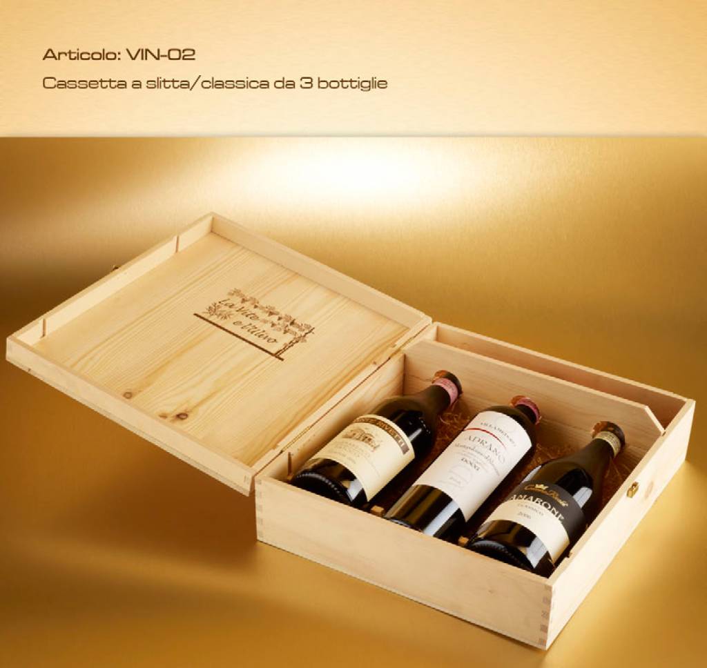Art. VIN 02 Cassetta legno massello con logo 3 bott: Amarone Classico Valp. doc 2006 - Campo Reale/ Barbaresco Micca docg 2006 - Dante Rivetti / Adrano Montepulciano d'Abruzzo docg 2006 -Az. Villa Medoro Opzione* Rosso di Montalcino 2010 -
